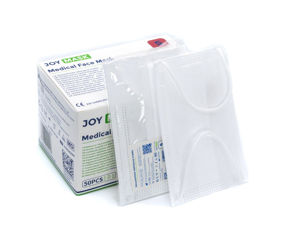 Balenie obsahuje 50 ks zdravotníckych rúšok JOYMASK v menšom rozmere, vhodných pre deti a menšie tváre. Každý kus je samostatne balený s popisom.